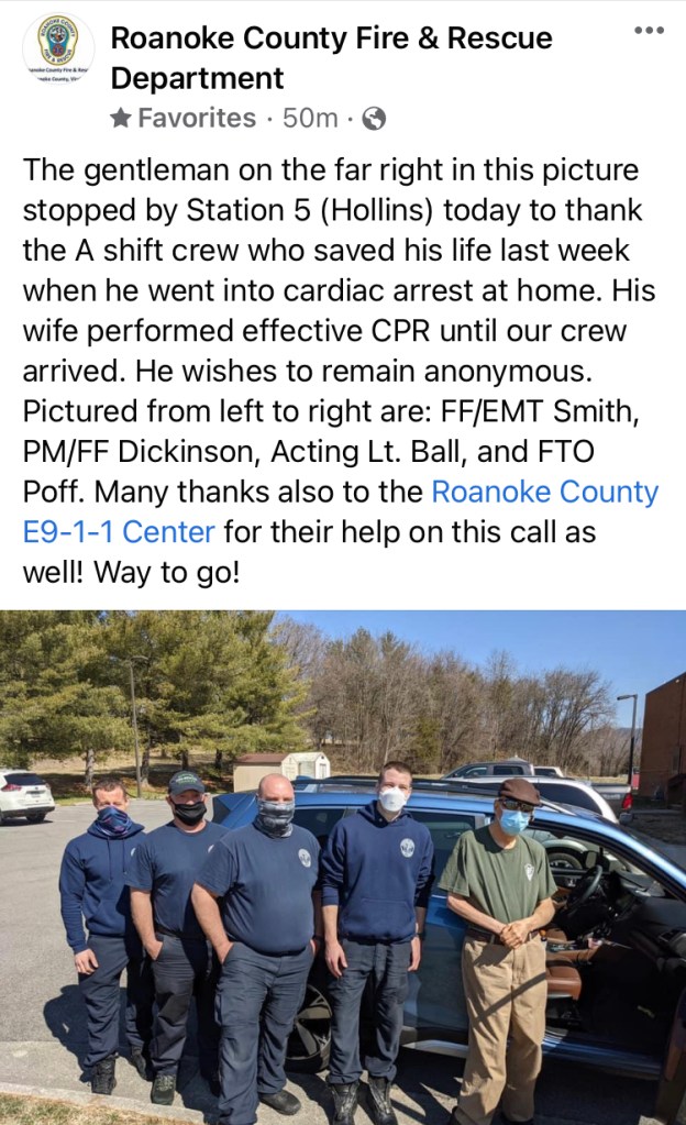 A client in Roanoke City had a visiting vendor collapse. CPR was started immediately and a shock was delivered with the client’s AED. The vendor was speaking with EMS prior to being transported to a local hospital.